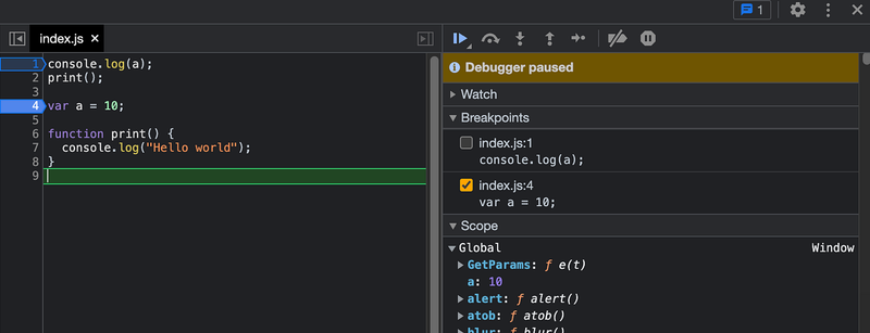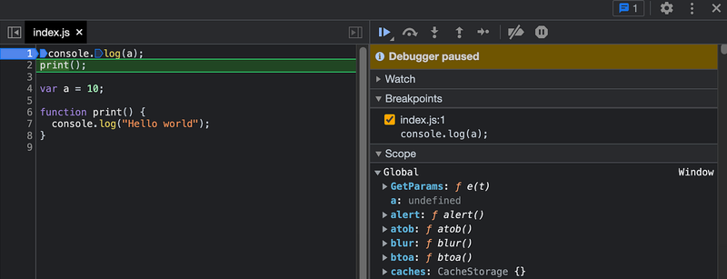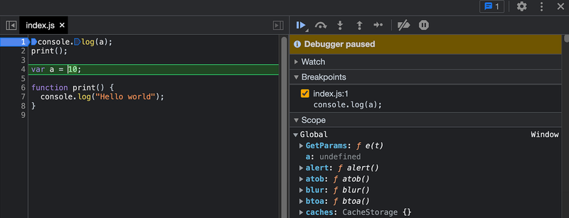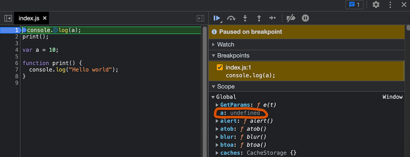 When we put a debugger at line 1, we observe that inside the Global scope, a is undefined as we have discussed previously. The console statement prints undefined to the console.
