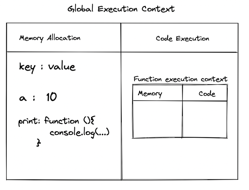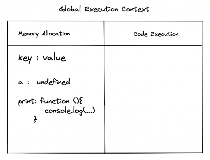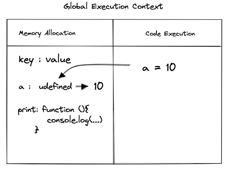 Let’s run our code keeping in mind the global execution context. In our code, we are declaring a variable named a, and a function named print . When we run the code, a global execution context is created. What the JavaScript engine does is it identifies the variables and functions and then allocates them someplace in the memory. These variables and functions are stored as key-value pairs in the memory.